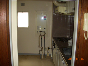 (2)キッチンを入れ替えるだけでなく、壁面に露出している給湯器をベランダに移動させることで、見た目にもすっきり美しく、有効スペースの確保もできました。